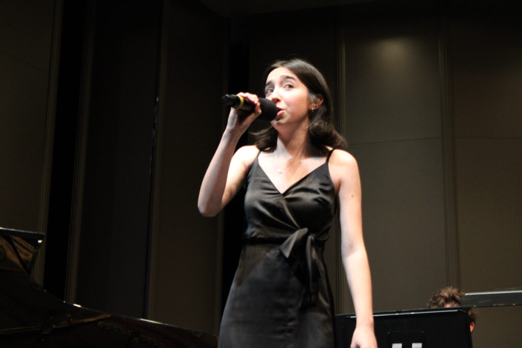The Jazz Ensemble followed with a beautiful set of romantic jazz covers, adding melodic vocals to the theater’s ambiance. “Falling in Love with Love,” performed by senior Lia Lev, transformed the PAC into a scene of passion and charm. Lev’s warm pitch and soft vocals combined with flashy timbres of piano and a balanced series of gentle saxophones drew smiles and looks of awe from the audience.