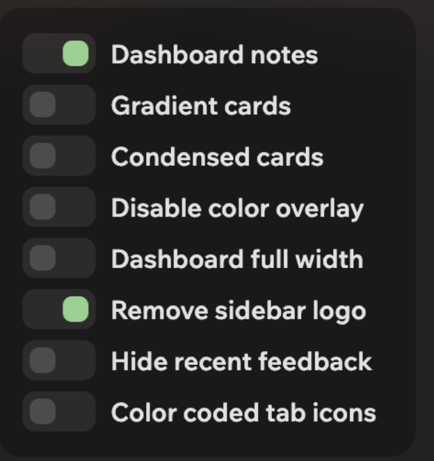 To add additional details, look through the toggles on the right side of the extensions. Here, you can toggle the switch for dashboard notes, disabling color overlay for your cards, or removing the school logo from your side bar.