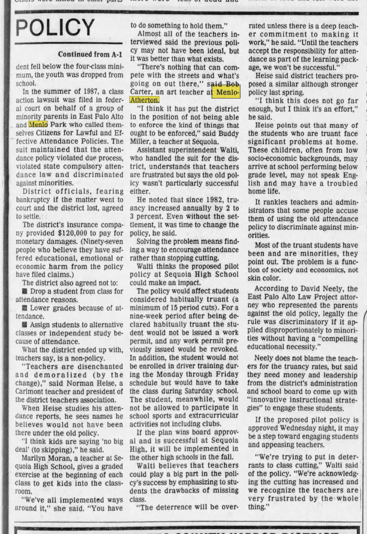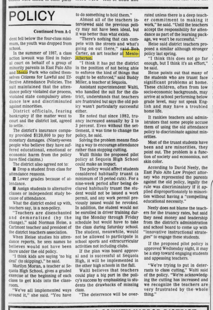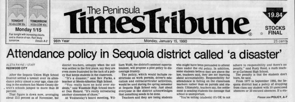 The ‘90s were also a period of low attendance and graduation rates. In 1989, parents of the Sequoia Union High School District’s (SUHSD) students from Menlo Park and EPA sued the district for an attendance policy that cracked down unfairly on minorities. They won. According to a 1990 Peninsula Times Tribune article, the result was a “disaster non-policy,” where “teachers lost students who might have been persuaded to attend class under the old policy.” In 1989, attendance declined to almost 70%—a record low. For comparison, in the 2021-22 school year, SUHSD’s attendance rate was 92%.
