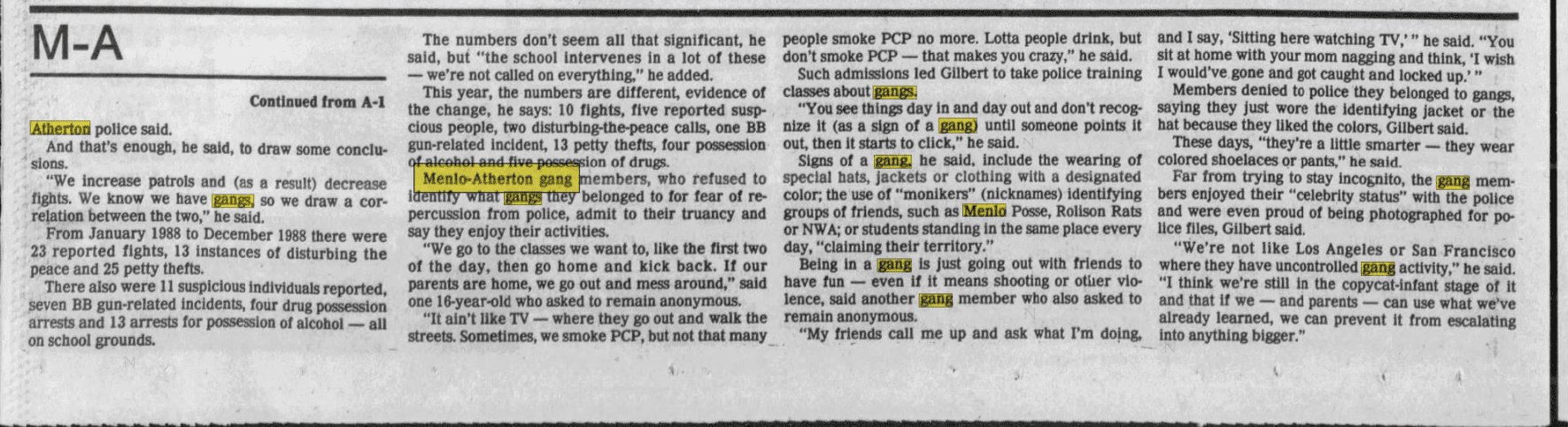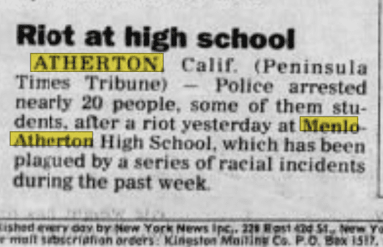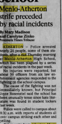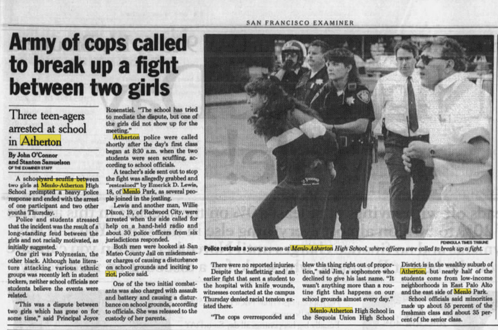 On Thursday, May 10th, 1990, around 50 police officers from six different law enforcement agencies swarmed M-A’s campus and arrested 20 students. A fight had broken out between two long-feuding girls and quickly blew up into a riot, exacerbated by recent racial incidents on M-A’s campus. According to the Sacramento Bee, “Police units from Atherton, Menlo Park, EPA, Palo Alto, California Highway Patrol, and San Mateo County Sheriff’s Department responded. Police were called to campus at about 8:30 am with reports of students all over campus striking each other and yelling.” The scene was chaotic. “Students were forced into classrooms and tried to peer out doorways as the screaming intensified… officers had to physically subdue many students to break up the fights. In a commons area, scuffling girls screamed as police pulled them away from trees where they tried to cling.”
