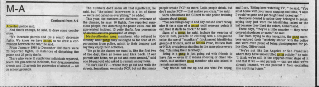 At the time, M-A had an open campus, so many fights took place off-campus. The parking lot of what is now J&J’s Hawaiian Barbecue “was pretty busy at lunch,” Williams said. The guys who really wanted to get into it did it there.” Tension and fights between gangs were largely determined by neighborhood lines. Williams noted, “there wasn’t trouble between East Palo Alto gangs on campus. There was trouble between Redwood City gangs and Palo Alto gangs.”