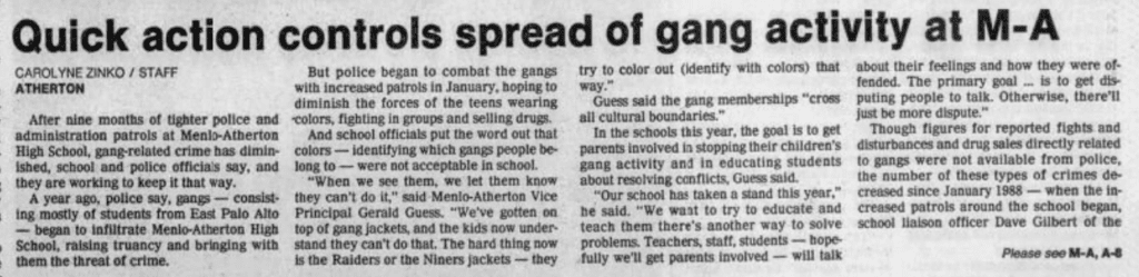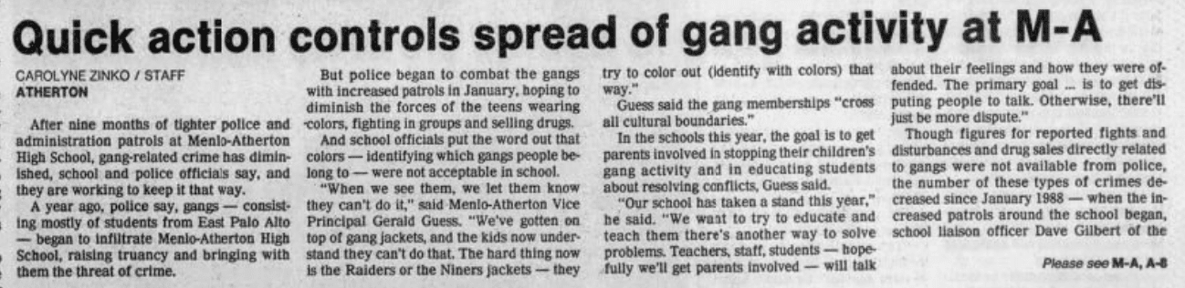 In a 1989 article from the Peninsula Times Tribune, M-A Vice Principal Gerald Guess said, “We’ve gotten on top of gang jackets and the kids now understand they can’t do that. The hard thing now is the Raiders or the Niners jackets — they try to color out (identify with colors) that way.” Furthermore, school officer Dave Gilbert said other signs of gang affiliation could include “nicknames identifying groups of friends,” and “students standing in the same place every day.” Students balked at this. In a letter to the Tribune responding to this article, students wrote, “Does this mean that if I and my friends decided to wear Raiders jackets and fluorescent shoestrings we are subject to questioning? Mr. Gilbert, get serious!” Even today, M-A’s dress code dictates, “No dominant colors are allowed if determined to be gang-related.”