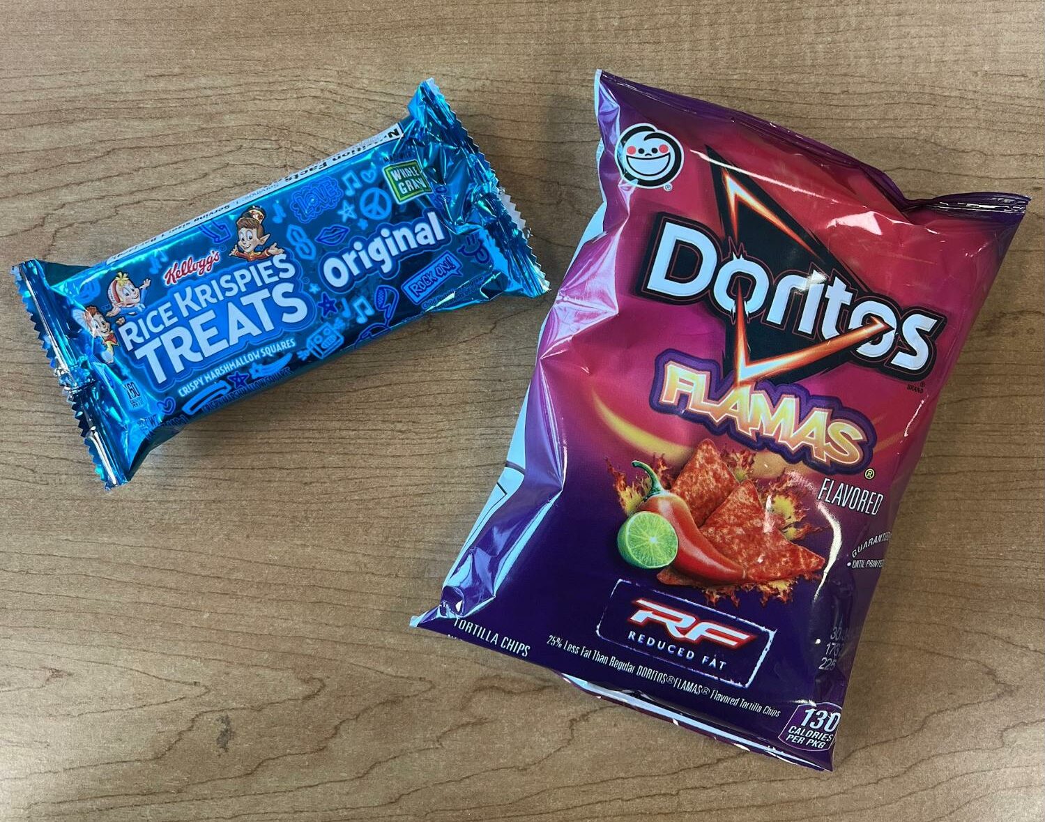 Both the Doritos and Rice-Krispie Treats sold in the vending machine are heavy in carbohydrates, and the Rice Krispie is extremely high in sugar. According to the nutrition label, the Doritos contain 20g of carbs and 5g of fat, the Rice Krispie Treat has a whopping 11g of added sugar in the form of corn syrup and 30g of carbs. In particular, the Rice Krispie treat has nearly no nutritional value, only containing trace amounts of vitamins and minerals.