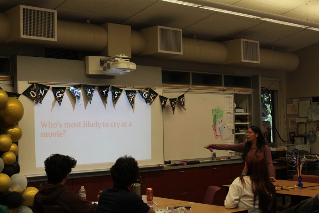 The next activity, led by senior Joanna Ramirez, was a game of “Who is most likely to?” Students had submitted their responses to prompts given before the event, ranging from funny ones like “Who is most likely to talk their way out of a speeding ticket?” to heartwarming ones like “Who is most likely to be a good parent?” Students then shouted out who they believed was most suited for each category, comparing their guesses to survey results. Most of the guesses were correct, demonstrating how tight-knit the group is.