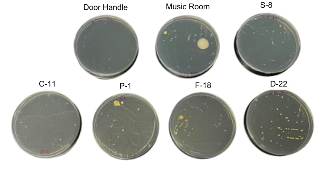 All six passes showed bacterial growth. The only dish that showed little to no growth came from the PAWS door handle—the UV from frequent sunlight may have killed most bacteria.