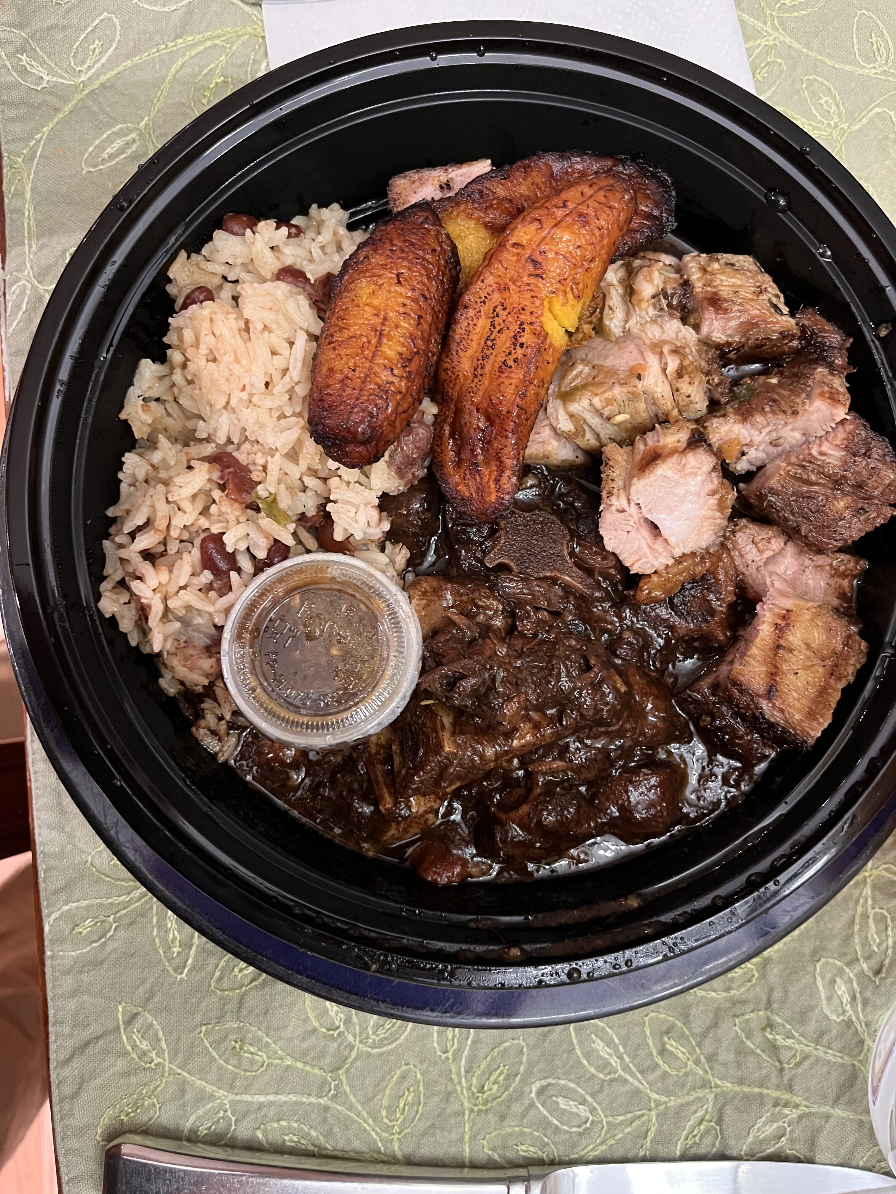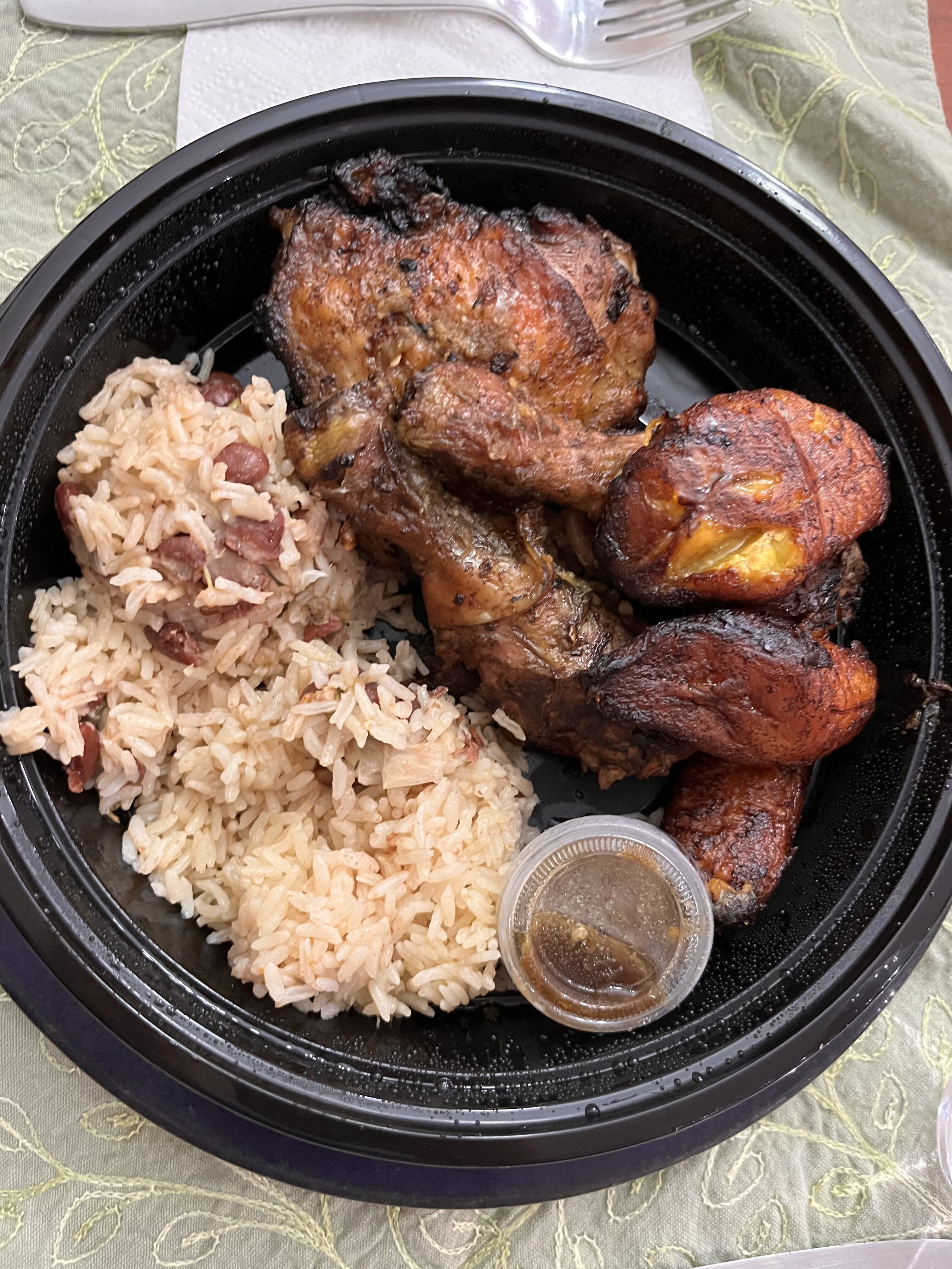 She said that she usually gets “the pork and chicken jerk combo, and the sweet potato coconut pudding for dessert. The greens are good, the mac and cheese is good, the combo with the sides is two meals, which can be helpful to have in my house.”