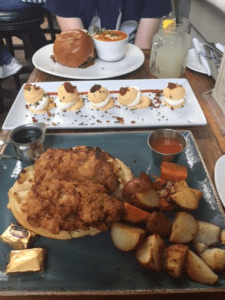 Upon deciding to enjoy our meal inside the restaurant, we were seated at a small, wooden table near the front of the room, close enough to the outdoors to enjoy the chatter of the outside world while still subject to the comfortable indoor climate. We took a moment to stare in awe at the menu which, while extensive, contained multitudes of equally appetizing options from soups to salads to sandwiches, not to mention a laundry list of beverages on the back. We were so distracted that by the time our waiter had come over a few minutes later we realized we hadn’t even considered our entrees. Jasper and I are similar in many ways when it comes to food. Primarily regarding our appetites and favorite foods (Hint: huge appetites, tons of junk food), so naturally we gravitated to the two most calorie-dense and hearty items we could find — Mary’s Organic Fried Chicken and Waffles for me and a BBQ Brisket Sandwich for Jasper. Additionally, we couldn’t resist ordering a small plate of bacon-topped deviled eggs to split and two fresh lemonades to wash it all down.