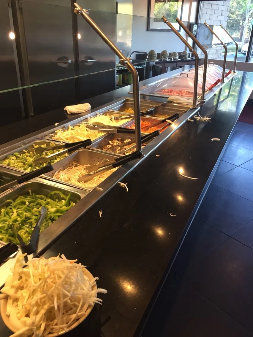 I’ll admit, that on walking into Mongolian BBQ, located on 700 El Camino Real, my first impression was pretty bleak. There was no decoration beyond its blank white walls and a featureless gray carpet in the vast, open room. It was definitely one of the less inviting restaurants we’ve ever reviewed; the room was bare aside from the cash register, tables, and the counter itself. The counter was bracketed by glass panels with each type of meat labeled on it: beef, chicken, pork, and lamb (only available on weekends or dinner). There was also a tray of egg noodles and a healthy helping of sides: pineapples, carrots, tofu, and plenty more.