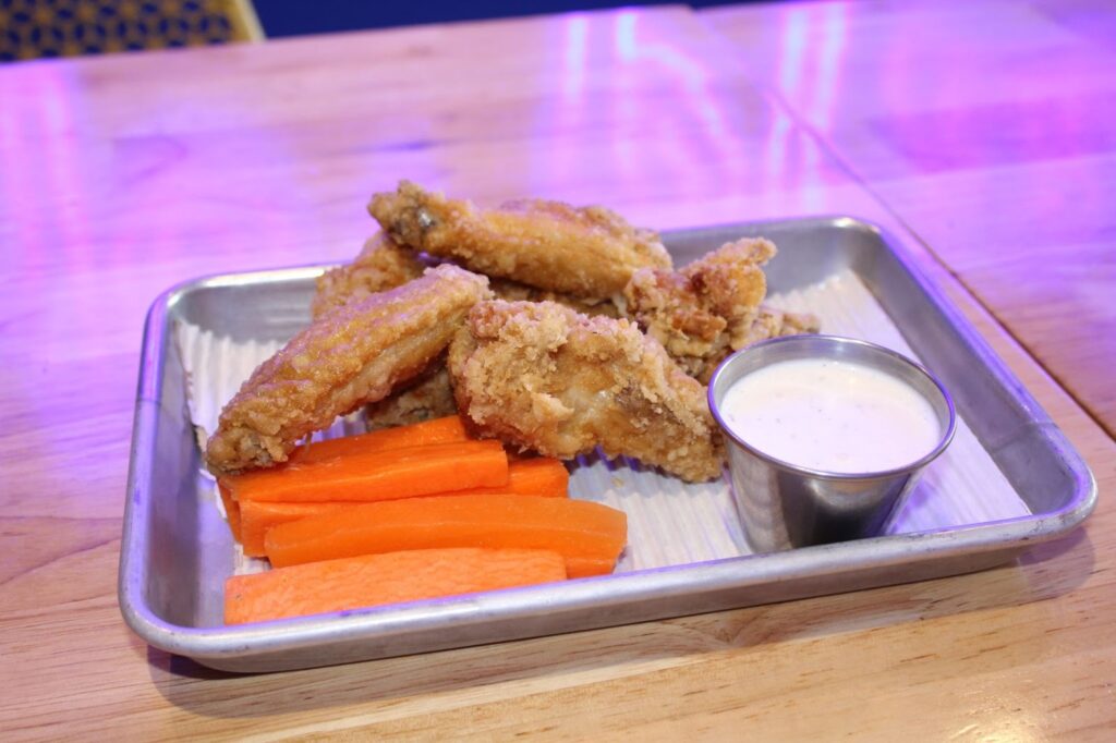 The plain wings are underwhelming at best. The outside is crispy, and the meat is tender, but the lack of flavor sticks out like a sore thumb, bringing down the rating. Instead of the plain wings, one should opt for the flavored wings. While the wings are bland, the carrot sticks taste garden-fresh, and the ranch dressing is flavorful.