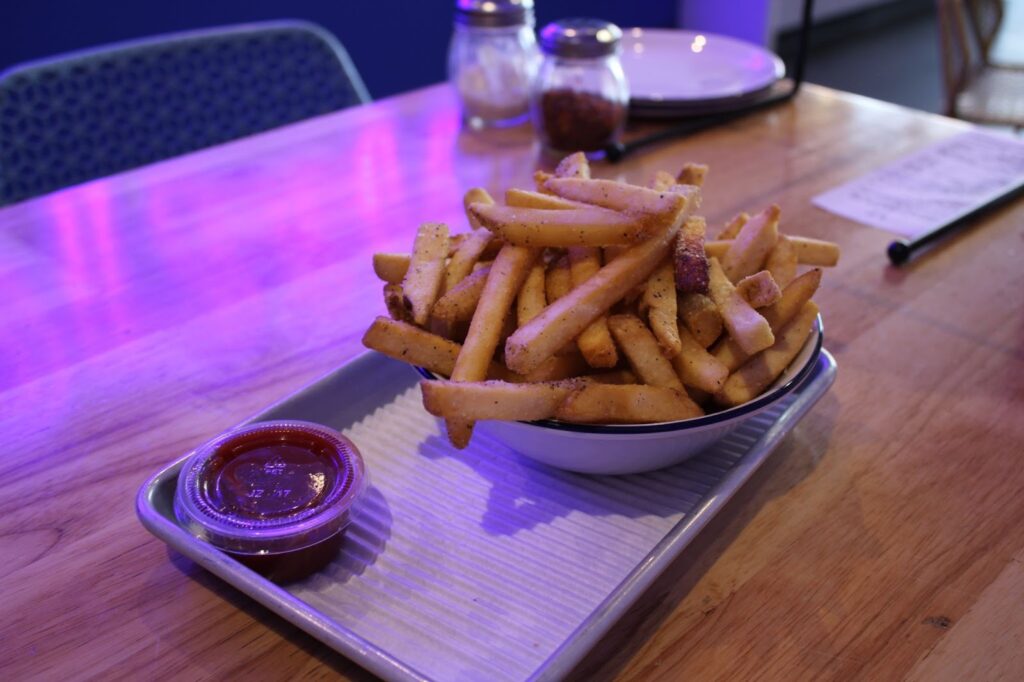 Steamy and fresh, these fries are a pleasant addition to a delicious meal. Paired with ketchup and doused in salt and pepper, these are your classic, simple fries. They’re a great choice for an appetizer.