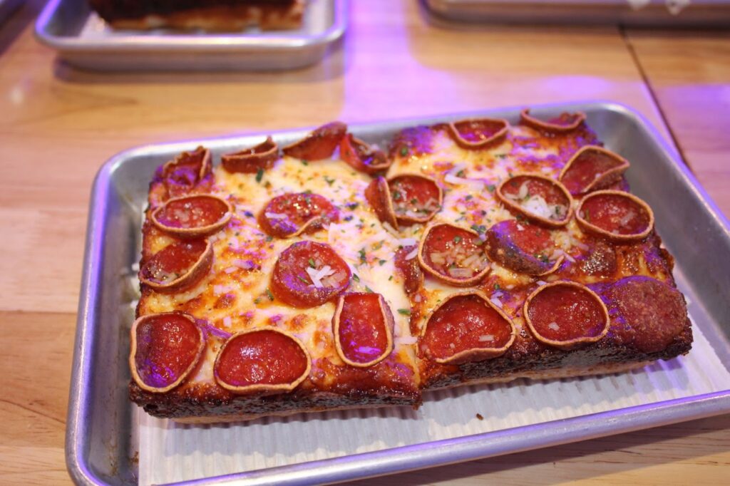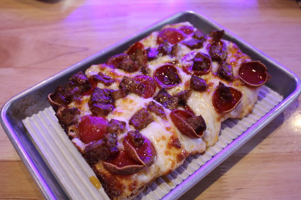 The half slice of the pepperoni pizza is the perfect size to split between two people. It comes out hot, covered with exactly 24 pepperoni, just as promised. With stretchy cheese and a hard crust, the Detroit-style pizza is perfectly soft and crunchy. The tomato sauce adds a nice tangy flavor to the pizza, but is quickly buried underneath the layers of cheese and salty pepperoni.