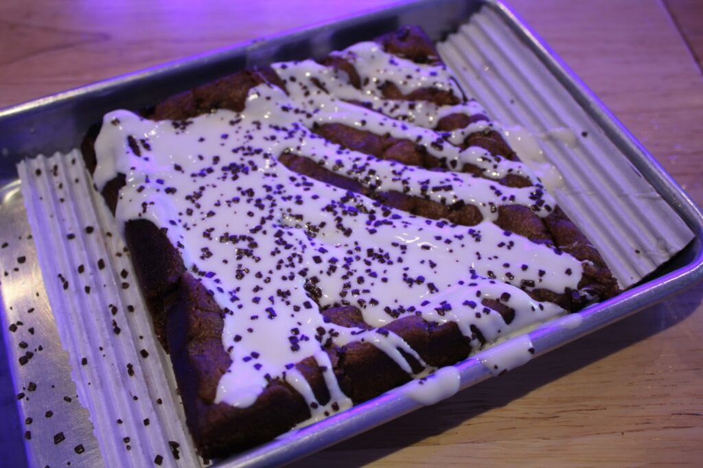 The cookie is delivered fresh out of the oven, doused in white chocolate, and sprinkled with chocolate shavings. Though it’s more like a brownie than a cookie, this dessert melts with its soft and gooey inside. Biting into the crunchy outside, the cookie is an immediate favorite from the menu. Its perfect texture and excessively sweet flavor quickly becomes addicting. However, the size of the cookie is a bit much for only two people, and the sugar overpowers the other elements in the dessert.
