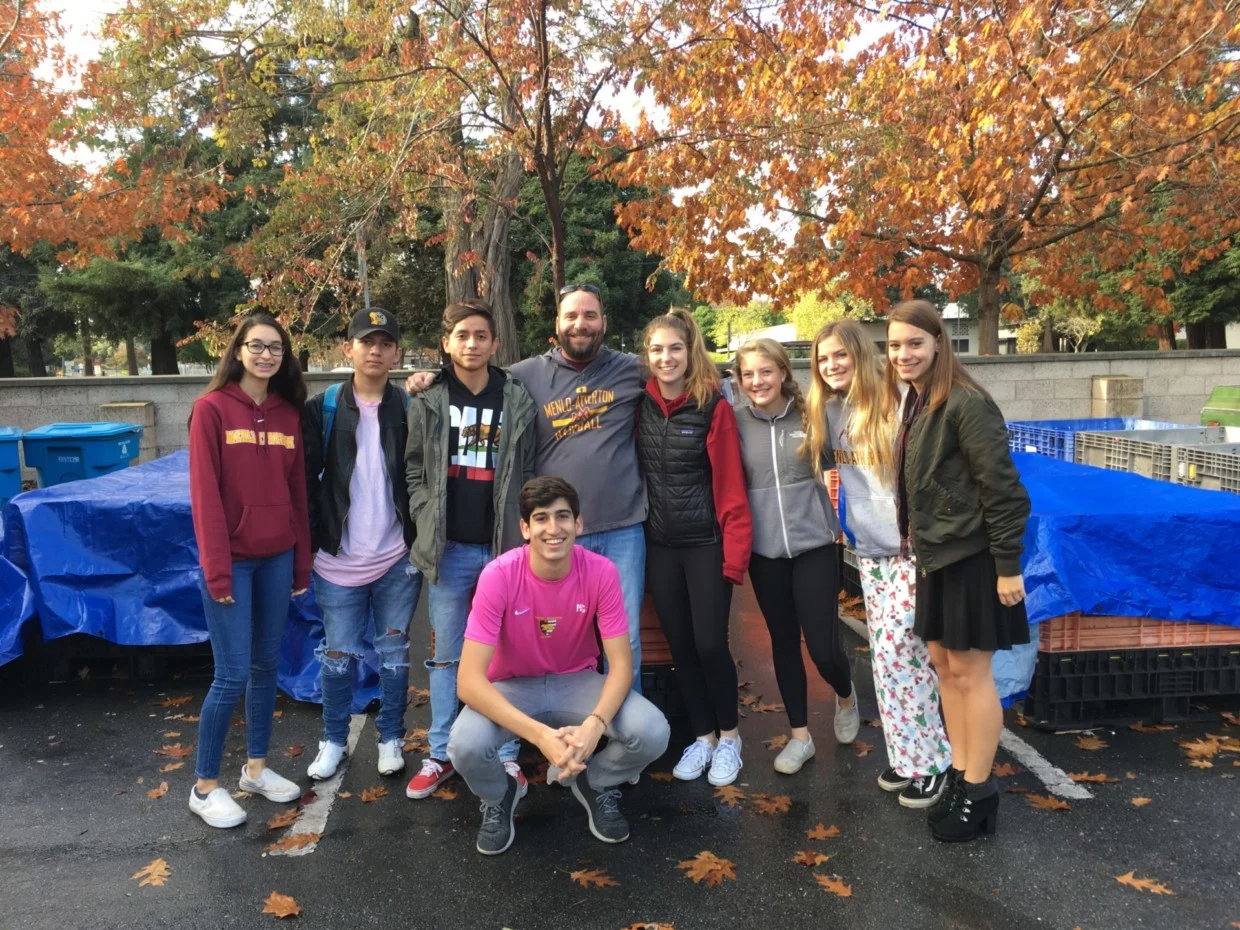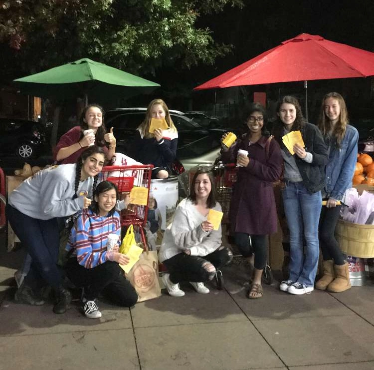 Sophomores pose in front of Trader Joes while canning. Top: Emma Dougherty, Nicole McCutcheon, Avani Anne, Jaime Durden, Zoe Buck. Bottom: Elena Maghsoodnia, Karina Takayama, Lindsay Atkinson. Credit: Kylie Wong.