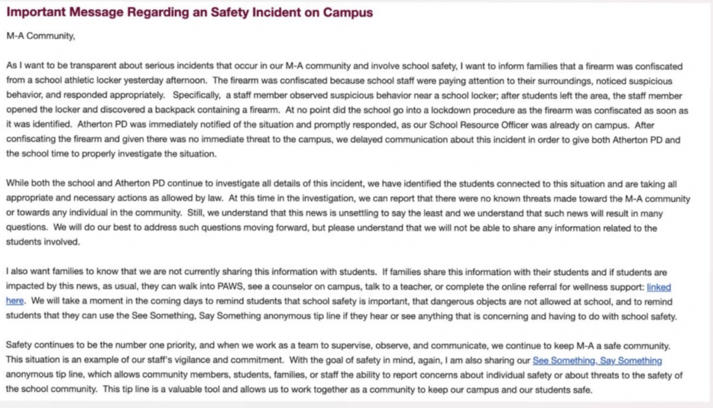 Principal Karl Losekoot first communicated with parents on Thursday afternoon, more than a full day after the incident. “We delayed communication about this event to give both Atherton PD and the school time to properly investigate the situation,” he wrote in an email to parents.