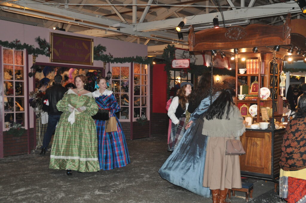 Upon entering the fair, visitors are transported to a world of cobblestone streets, gas-lit alleys, and bustling shops. Attendees dress in an array of attire: some dress in modern winter apparel, sweaters and jeans. Others fully embrace the Victorian theme. Women don corsets, voluminous skirts, and eye-catching headpieces, while men appear as chimney sweepers in worn-down clothes and newsboy hats or as formal gentlemen in long coats and top hats.
