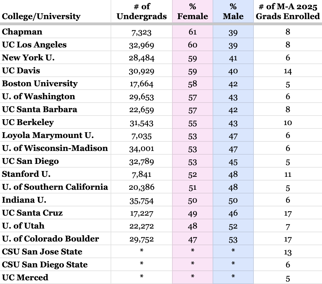 The Fiske Guide to Colleges 2026 reported the male/female ratio for 320 four-year colleges. The chart below highlights colleges and universities that enrolled more than five M-A students from the class of 2025. All but two of the 20 colleges highlighted are predominantly female.