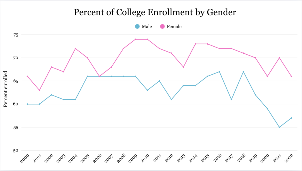 In 2021, colleges experienced the biggest gender enrollment gap with 70% of female high school graduates and 55% of male high school graduates enrolled. This trend continued in 2022, with 66% of female high school graduates enrolled in college compared to 57% of their male counterparts.