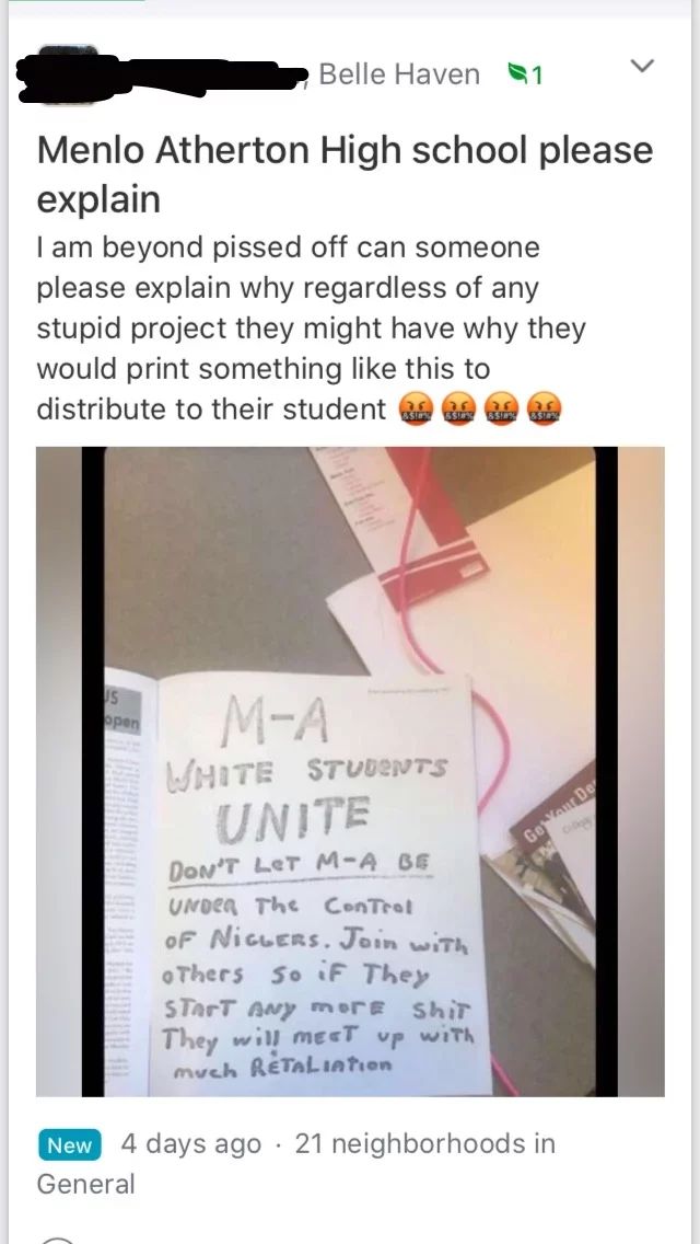 Within an hour of distributing the magazine, school administrators alerted the journalism class that staff and members of the community were upset by seeing the poster. While some students and staff were offended by the use of the N-word in the magazine, the circulation of the poster without its caption on Snapchat and Nextdoor, a community message board widely used by parents, spread confusion and outrage.