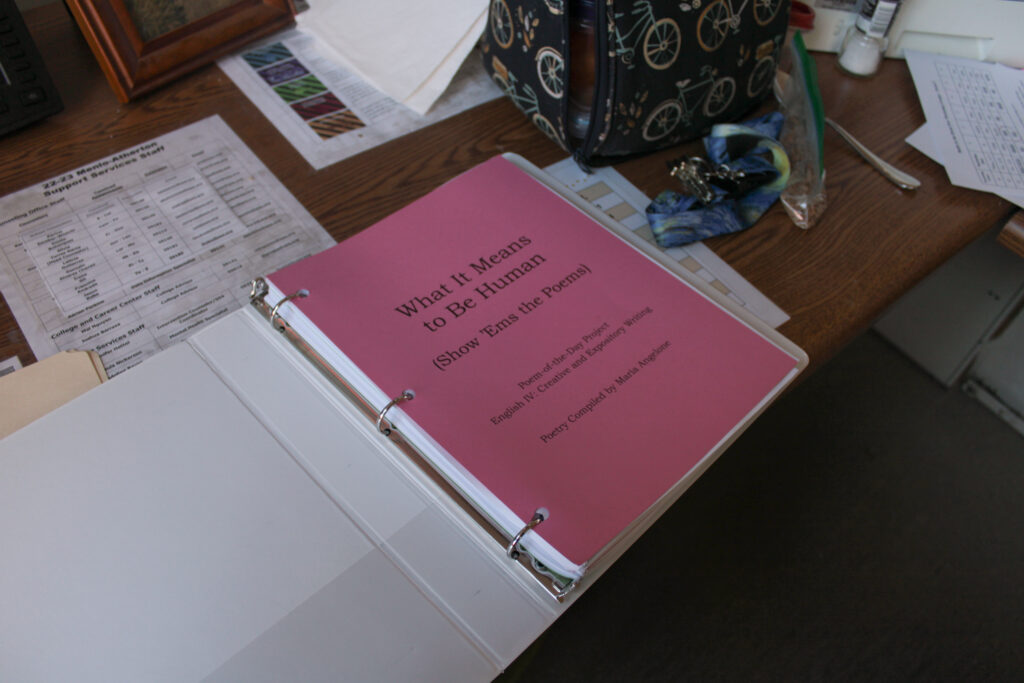 “I give them all a poetry reader of 180 poems at the beginning of the year,” Angelone said. “But I change that. I spend at least two weeks out of every summer revamping my poetry reader, keeping some poems, getting rid of a bunch, and because I’m always coming across new poems that I want to trade in and trade out.”
