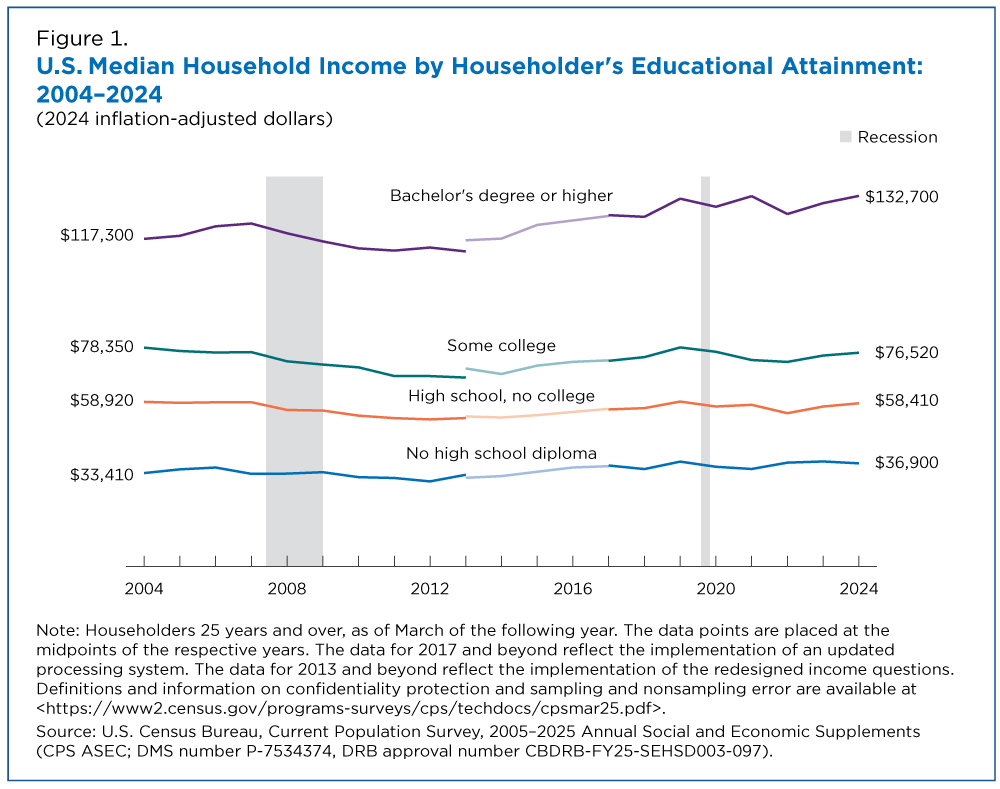 College completion is closely tied to socioeconomic status. Households headed by someone with a bachelor’s degree or higher have a median income that is $74,290 greater than households headed by someone with only a high school diploma. When advocating for 504 access, parental education and literacy offer significant advantages in interpreting Section 504 and IDEA, which were written at a 16th-grade reading level, according to Burke.