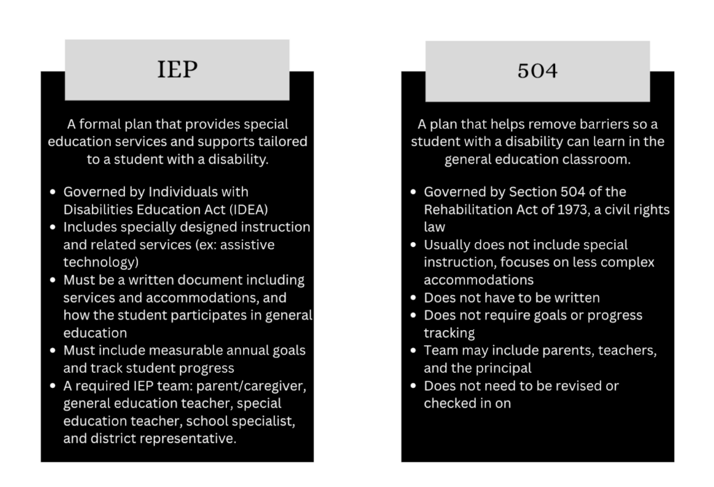 504s are ambiguous in both their requirements and accommodations. “[The plans] don’t tend to list why a student is getting a certain accommodation, or any type of evaluation data that’s been used to determine that they qualify for 504,” Burke explained. “It doesn’t even tell you necessarily who’s at the meeting to develop the accommodations.”