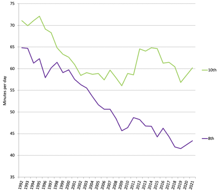 In the U.S., the percentage of adults who reported reading at least one book per year fell from 54.6 to 48.5% between 2012 and 2022. The number of 13 year olds who reported reading for fun “almost every day” fell 13% from 2012 to 2023. For eighth and twelfth graders, national reading scores have been continuously dropping from 1992 to 2019.