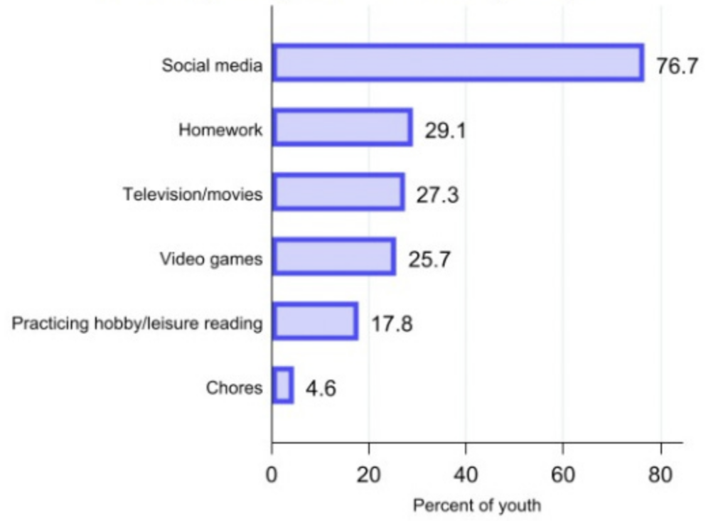 As of 2023, U.S. teens are spending more time on social media than they are on school work, despite a perceived increase in workload.