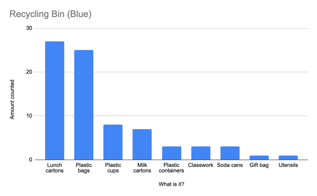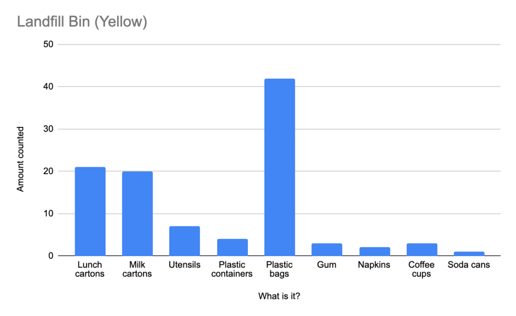 Cardboard and paper lunch containers were also commonly found in the landfill bin, when they should actually be placed in the compost. Milk cartons were another frequent item, however these belong in the recycling bin.