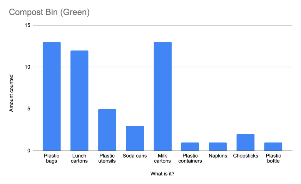 The compost bin showed some of the highest sorting errors. Milk cartons were the most frequent item, which might seem compostable due to their paperboard material that many assume is biodegradable. Despite this, they are often coated with plastic and sometimes include layers of aluminum that don’t break down as fast as compost. Plastic bags and wrappers were also a top item, despite not being compostable.