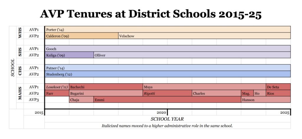M-A’s high administrative turnover is nearly all within the AVP office. While all three current AVPs are in their first or second year, IVP Emily Rigotti has been an M-A administrator since 2019, and Losekoot since 2011. IVPs and principals undoubtedly face heavy workloads and stress, but AVP positions can be particularly unsustainable due to their focus on discipline.