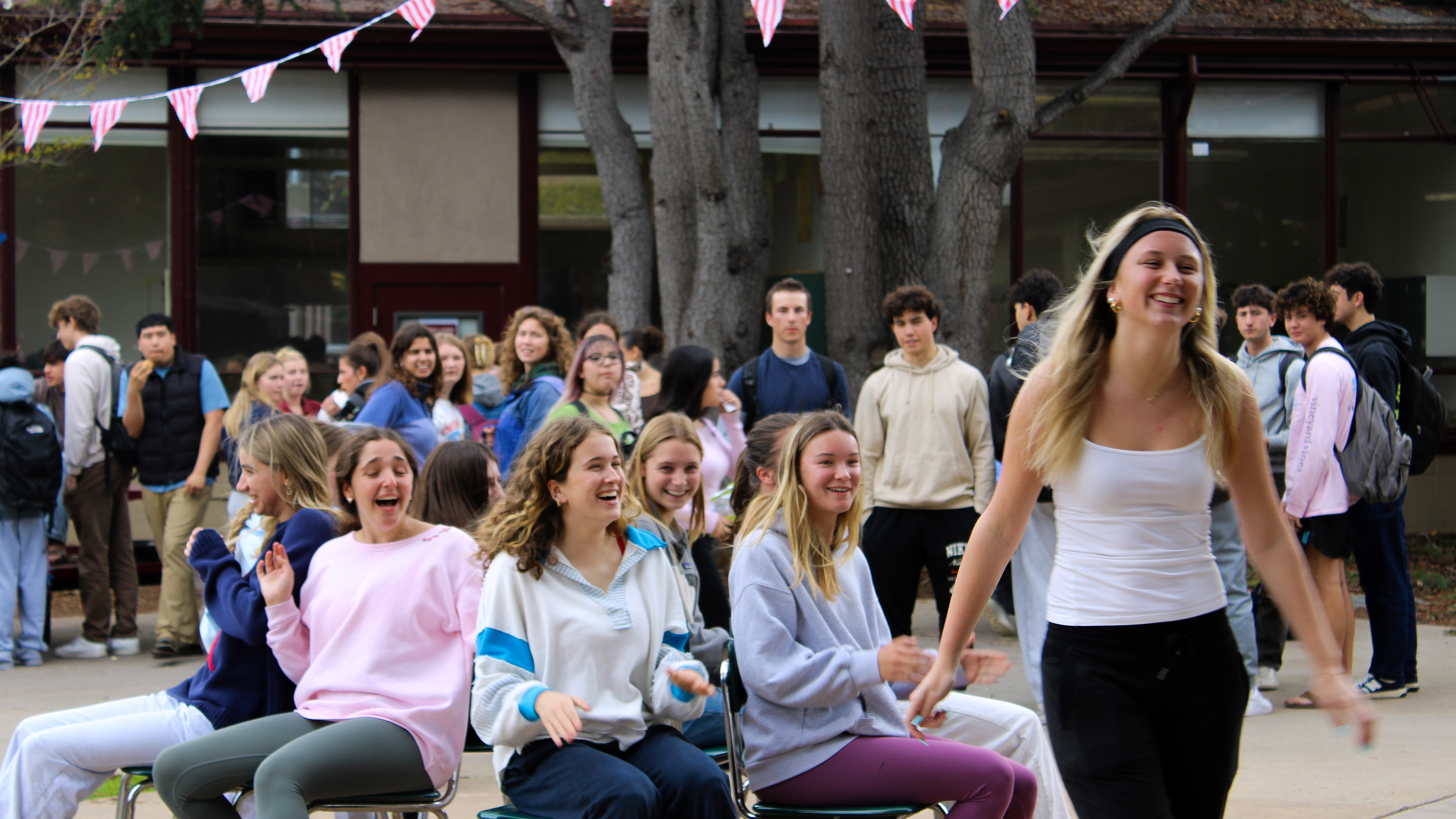 The event started off with an egg toss, where students got into pairs and had to spin in circles before throwing an egg to their partner, taking a step further away every time they were successful. After the game finished, Leadership called for volunteers to play musical chairs, and then brought on five more students for the hula-hoop competition.