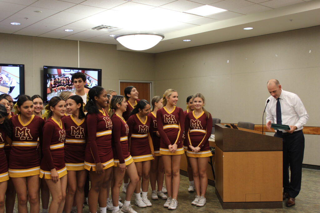 Members of the M-A Cheer team, along with coaches Averi Westbrook and Danielle Daniels, received a certificate of recognition from the District.