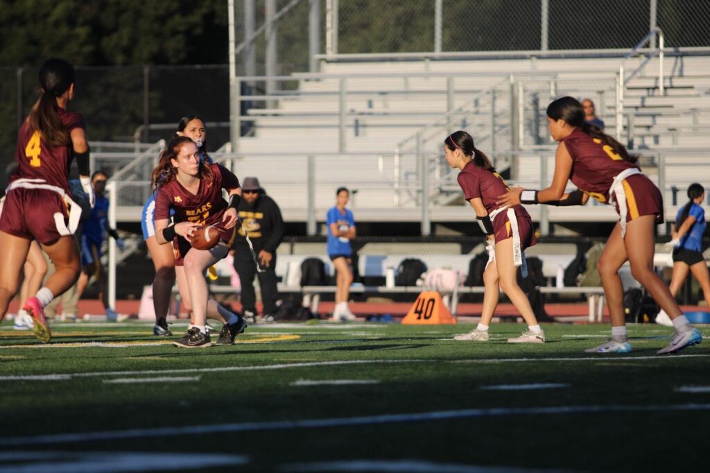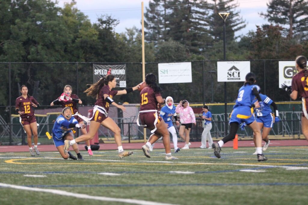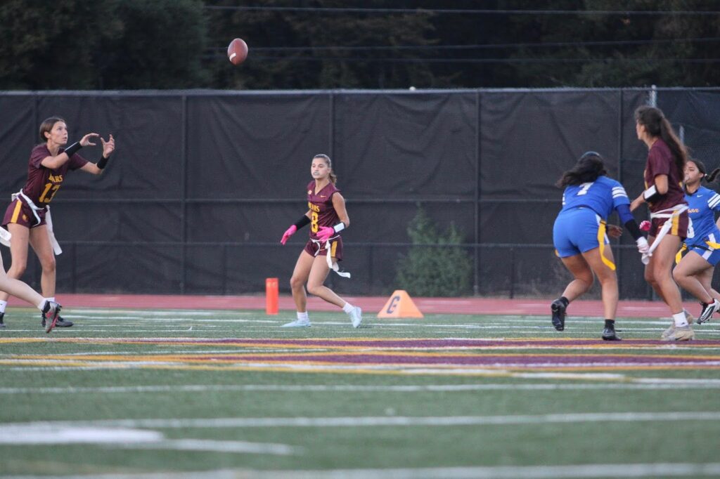 The Bears’ tight defense prevented the Grizzlies from converting on offense. Junior defensive back Juliana Pandolfo knocked down an attempted Jefferson pass, which was followed by a sack by senior linebacker Elise Koo, overall forcing the Grizzlies to punt. On the punt return, junior wide receiver Mo Rhai Balinton weaved through the Jefferson defense to score another impressive 40-yard touchdown for M-A. A successful one-point conversion by the Bears extended their lead to 13-0, with five minutes left in the first quarter.