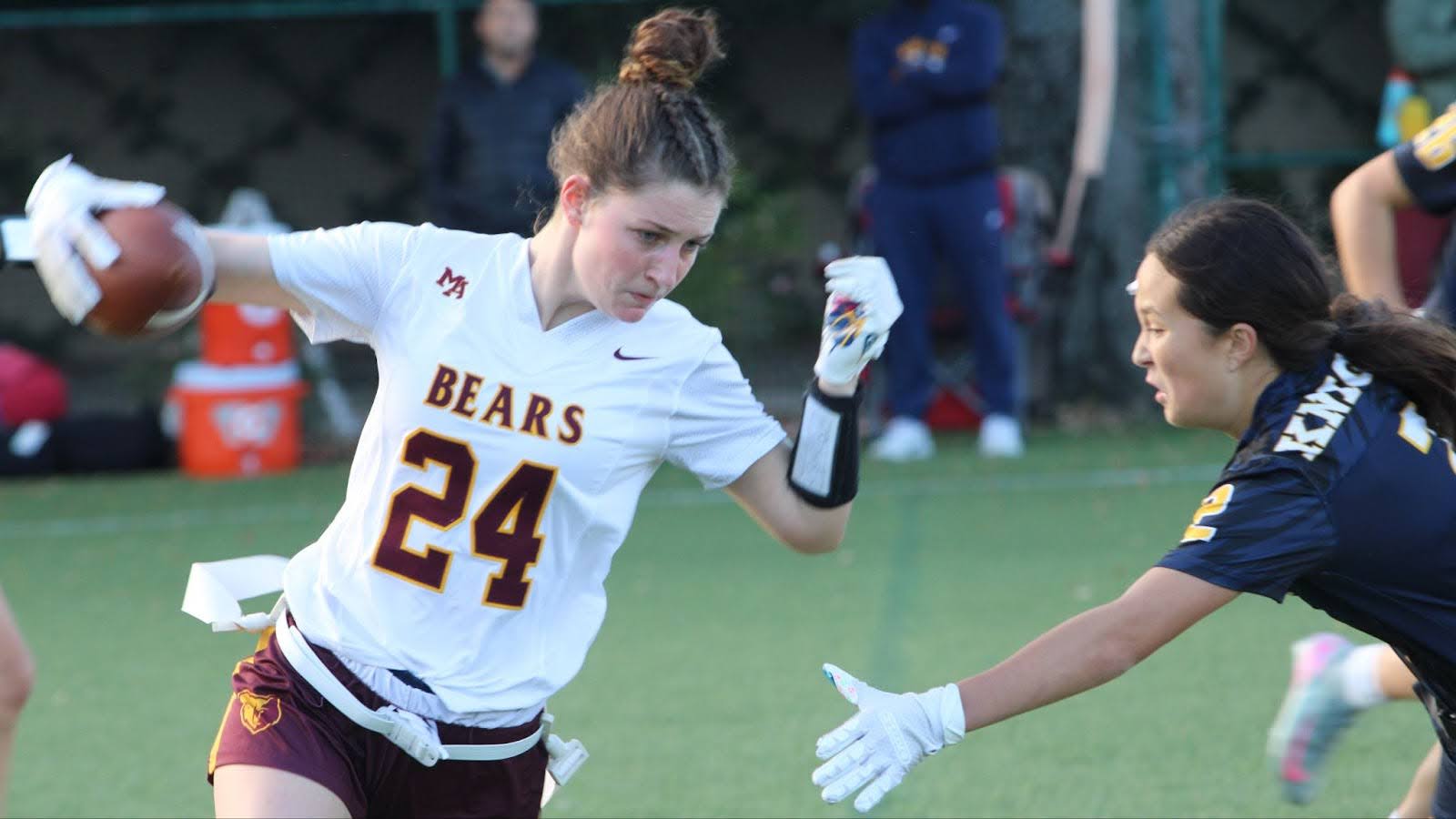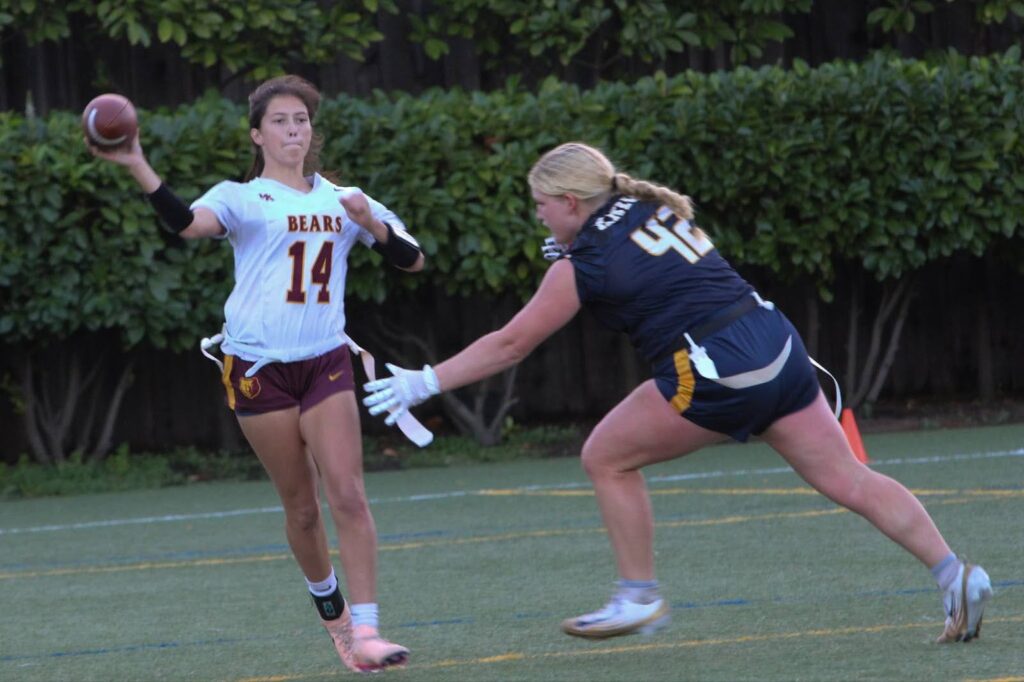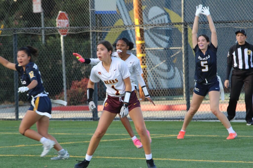 After winning the coin toss, the Bears opted to start with the ball. Senior quarterback Mae Kunihiro found sophomore wide receiver Cassidy Thomas cutting through Menlo’s defense for a quick first down. Kunihiro carried the ball, gaining several yards for M-A. However, numerous incomplete passes by the Bears forced them to punt.