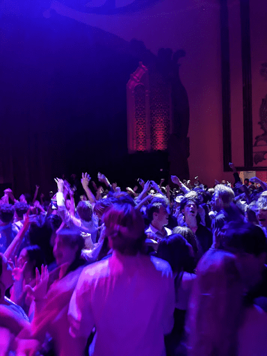 The theatre’s bottom floor seating had been rearranged to open room for a dance floor. Students squeezed into every inch of available space, often cramped back to back. Senior Naomi Stamler said, “Dancing was like getting trampled, but in a fun way.” Hoffman added, “And so many people made the room crazy hot.”