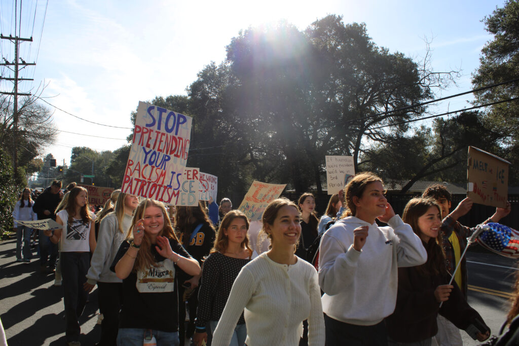 The walkout, which began at 10:25 a.m., took place along Middlefield Road and concluded four miles north at the San Mateo County courthouse in downtown Redwood City. Students left school peacefully, without any intervention from teachers or administrators.