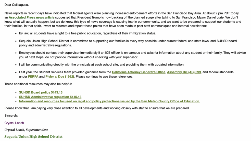 In response to heightened community fear following the deployment of federal agents to the Bay Area, Superintendent Crystal Leach sent an email reaffirming the District’s commitment to protect and educate all students regardless of immigration status. However, the District has yet to provide specific and updated guidance on how to navigate Immigration and Customs Enforcement (ICE), leaving many teachers concerned.