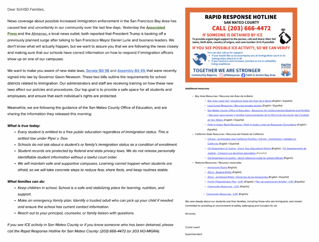 On Oct. 24, Leach sent a message to parents via ParentSquare. The message outlined the District’s immediate actions regarding immigration enforcement, directing parents to California State Senate Bill 98 and Assembly Bill 49