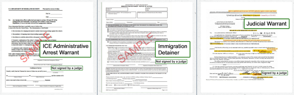 Administrative and judicial warrants can appear very similar, but there is a crucial difference to look out for. Judicial warrants will have a judge’s signature near the bottom of the paper. Administrative warrants are signed by an officer, not a judge.