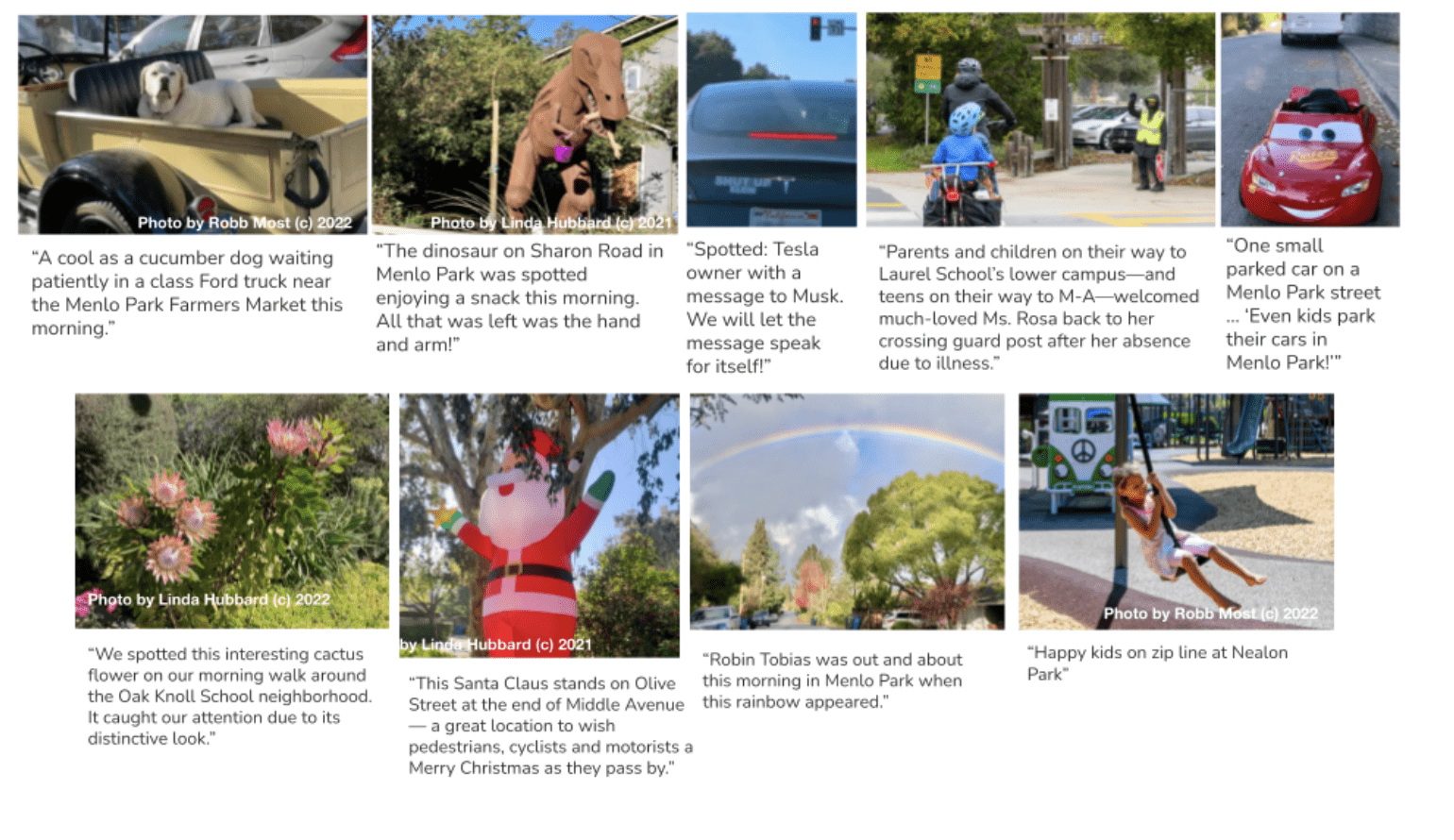 “InMenlo has turned out to be a terrific gift,” Hubbard said, “Because when you’re doing community journalism, people are earnest, committed to the community, and really trying to make a difference.” In addition to covering breaking news on InMenlo, Hubbard reports on topics from rain to community events, writes obituaries, and chronicles the things she spots around town, including rainbows, cute kids, festive holiday decorations, and more, in her “Spotted” column. Here is a sampling of the column: