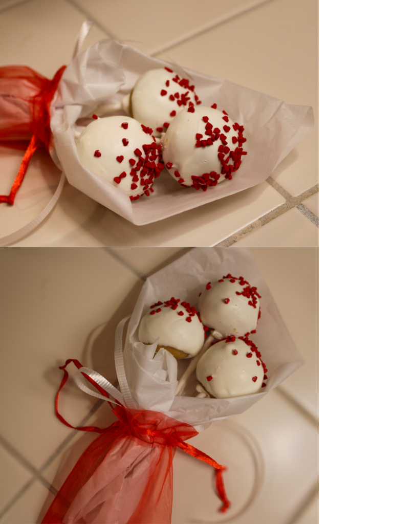 Step 7: Keep the cake pops with their sticks in the freezer until the chocolate is set. Have your chocolate ready for dipping in a skinny cup. Prepare a stand where you can stick your cake pops into, a styrofoam sheet works best, but pouring rice into a cup also does the trick. Dip each cake pop quickly, submerging it completely under the chocolate, and, while holding it over the cup, wiggle the stick to let excess chocolate drip off. Before the chocolate dries, coat the cake pop with your decorations, like little heart sprinkles, and stick it into your stand. Once the chocolate completely hardens, you can wrap three to four cake pops with tissue paper and tie with a little bow to form a delicious bouquet.