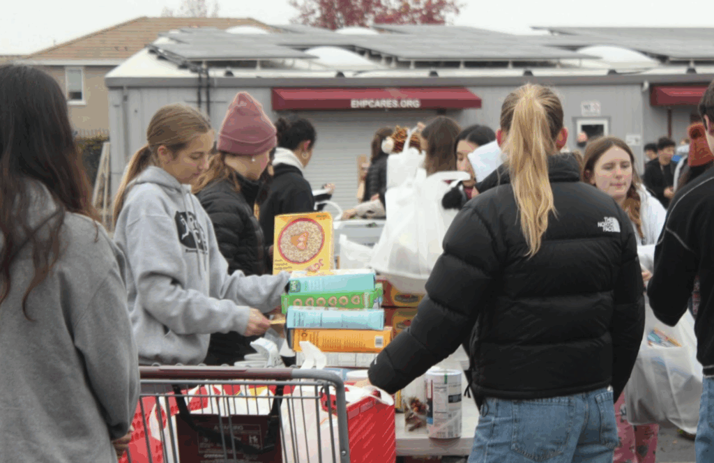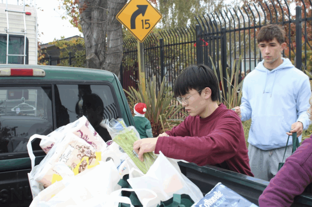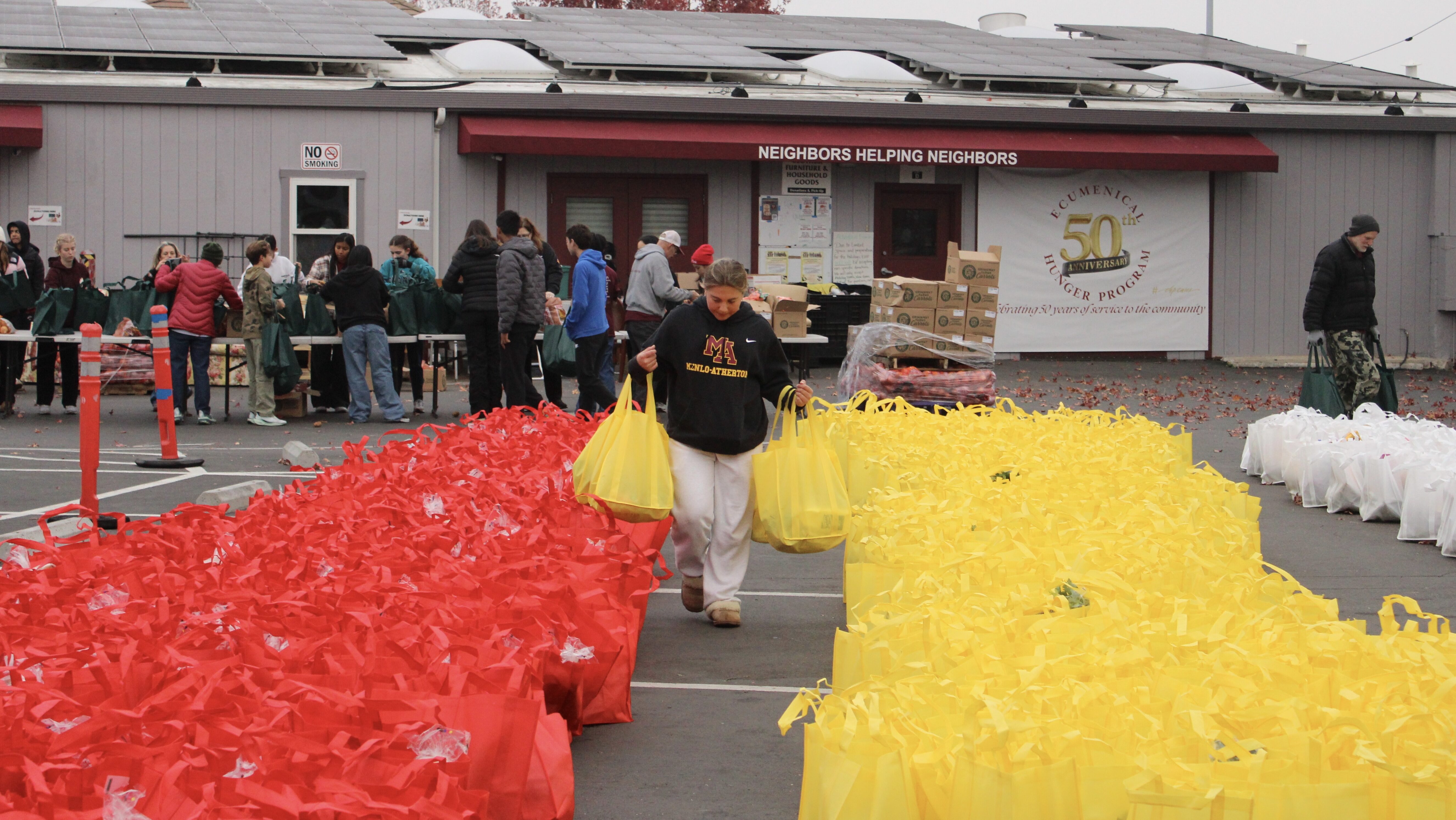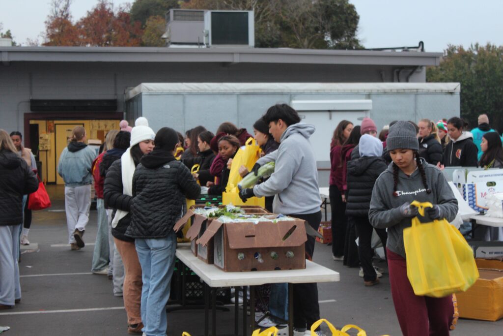 Leadership students arrived at EHP at 6:30 a.m. for D-Day, upbeat and eager to help. They unloaded can-filled boxes and set up assembly lines to sort the collected produce into color-coded bags. Soon, rows of neatly-organized bags covered EHP’s parking lot. “We work across all three periods to organize the drive, whether that’s social media, coordinating with the actual grocery stores, or the logistics of it all,” senior and organizer Aarii Keswani said.