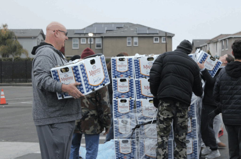 The distribution system quickly picked up speed. Volunteers cycled through various roles rapidly, and every participant found a way to contribute, whether it was stacking boxes or handing out egg cartons. Coffee, water, and donuts were provided to help keep all volunteers energized.