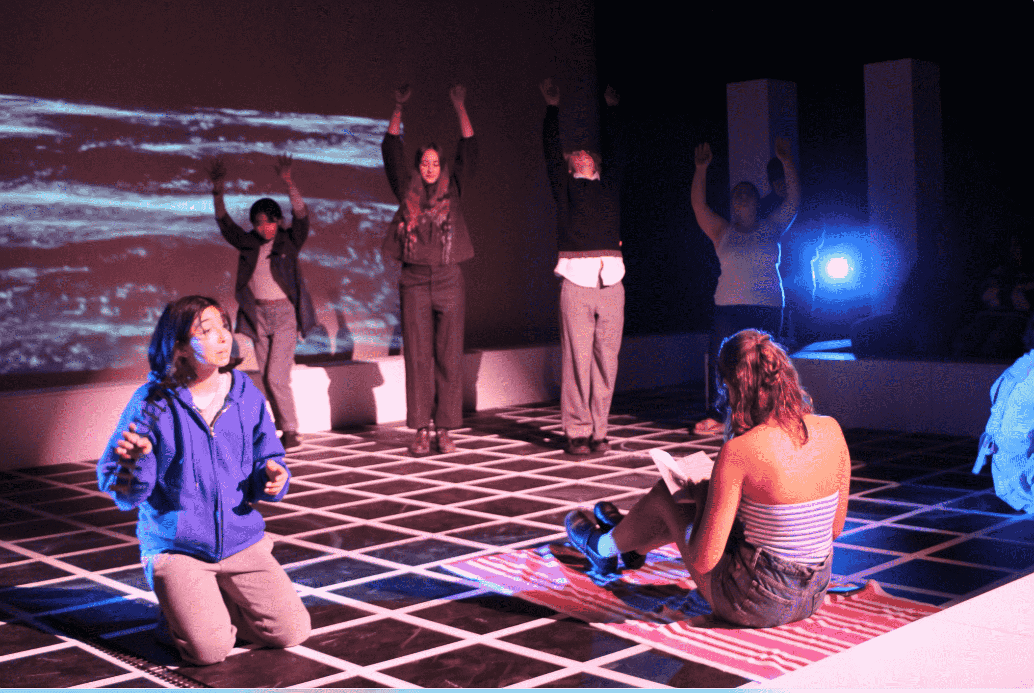 The production features a unique “blackbox” stage. Rather than being in the standard PAC seats, the audience is seated on the stage itself surrounding the actors on three sides.