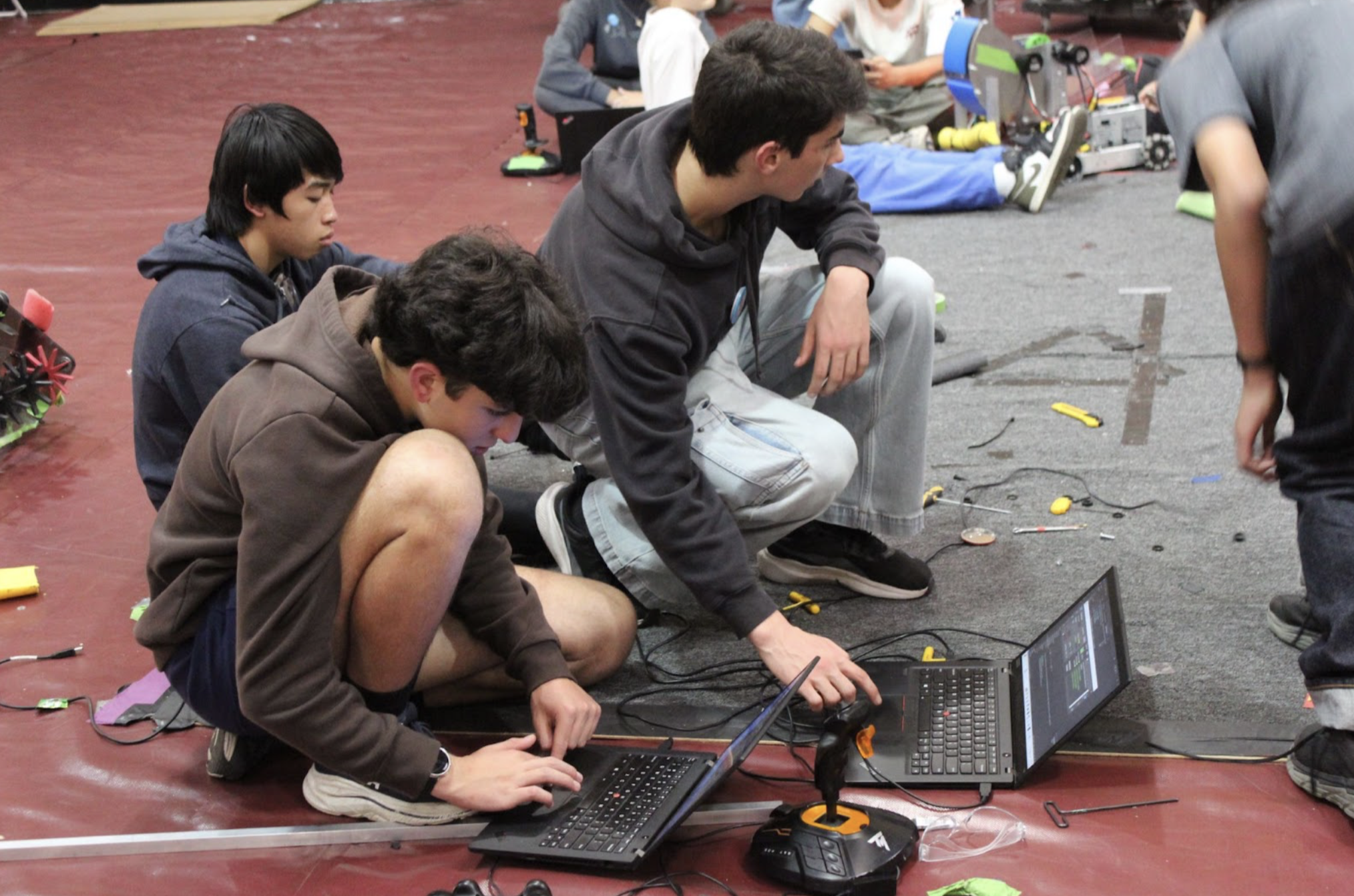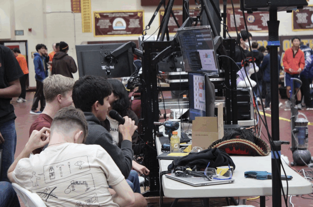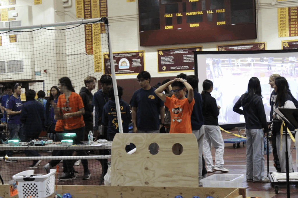 On top of the rookies working, veterans of the M-A robotics club diligently prepared the stage. They worked from Friday night until Saturday morning, planning everything, buying food and drinks for the robotics members, and even recruiting a crew of volunteers to help micromanage and clean the stage after every game.