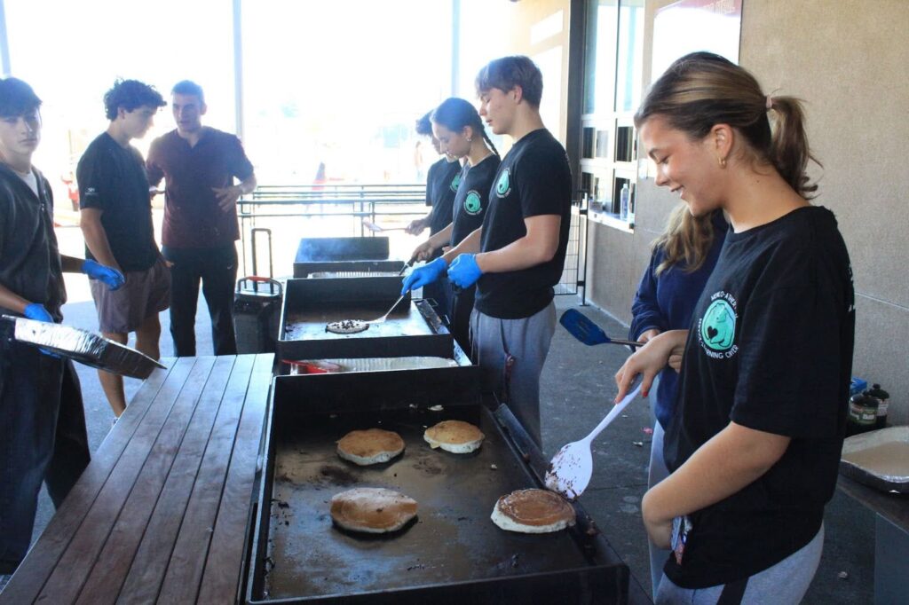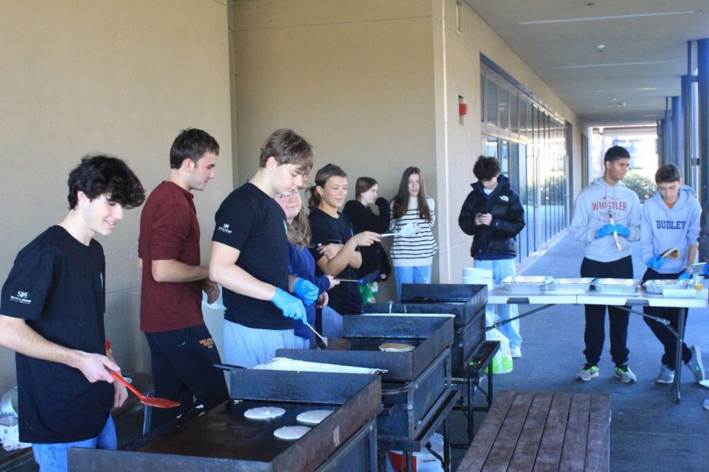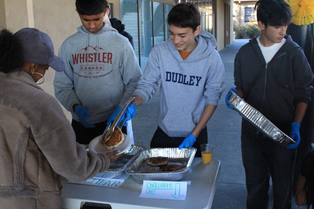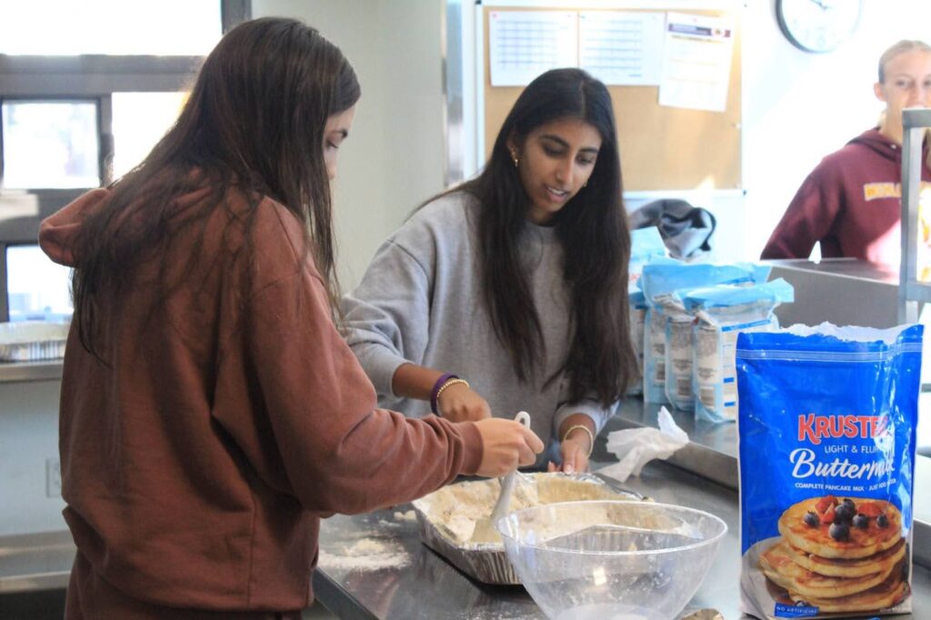 In the G-Wing kitchen, volunteers measured and mixed flour and milk, passing tins of pancake batter through the windows to the servers outside. Near the tables, freshman Wesley Saywell and others distributed food to those in attendance. Saywell volunteered for the Food Fair through the Service Learning Center, a club that meets every other Monday at lunch in P-5.