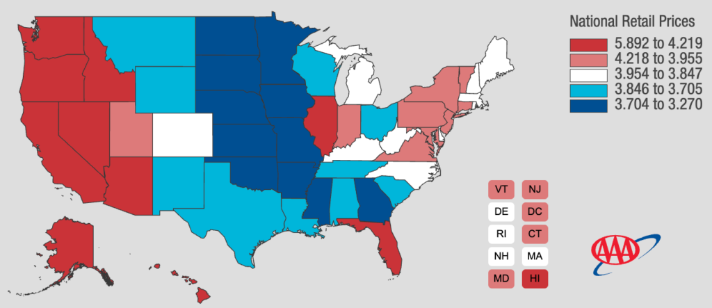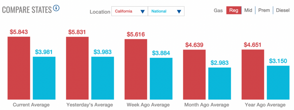 In an infographic from AAA (American Automobile Association) it shows the national average for regular gas prices in California ($5.893), aside the nation’s average of $4.125 per gallon, dwarfing the national prices by nearly $2. Furthermore, another shows that California has the single-highest retail price for gas.