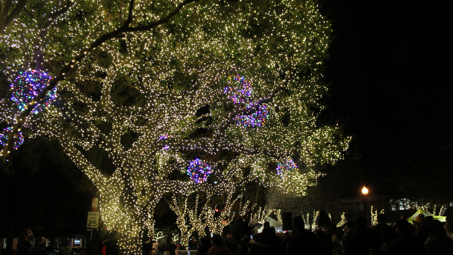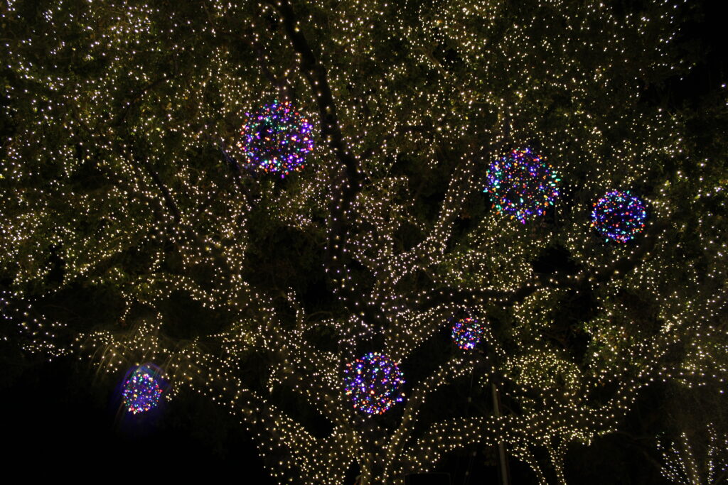 In previous years, the big redwood tree in Fremont Park was always the tree being lit up, but since it was struck with lighting about twenty years ago which left the tree in decaying condition, in 2024 it had to be retired. As a result, this year the big oak tree was chosen.