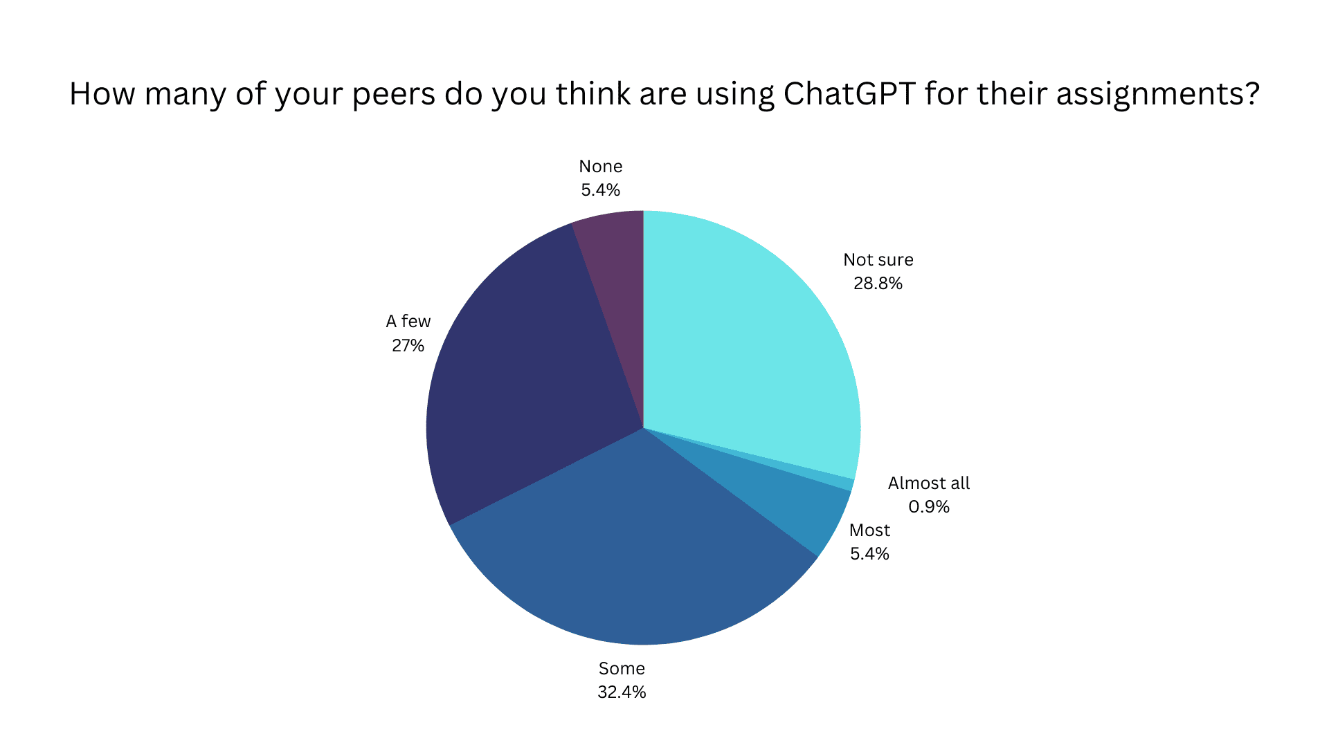 Students’ perceptions of ChatGPT usage among their peers didn’t match their self-reporting of whether or not they were using AI on their assignments. 39% of students said they thought either almost all of their peers, most of their peers, or some of their peers were using ChatGPT, 27% said they thought a few of their peers were using ChatGPT, and 5% thought none of their peers were using ChatGPT.