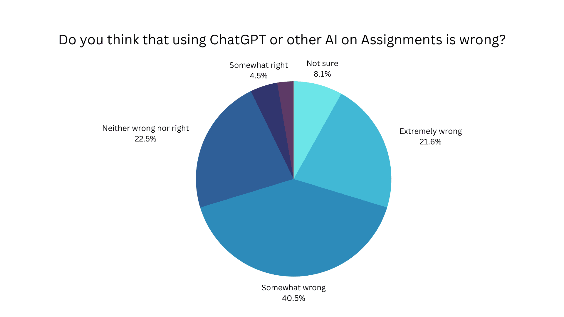 22% of students said they thought using ChatGPT was extremely wrong, 41% said they thought it was somewhat wrong, and 23% said they thought it was neither wrong nor right.